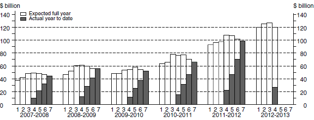 ACTUAL AND EXPECTED NEW CAPITAL EXPENDITURE TOTAL CAPITAL EXPENDITURE Estimate 4 for total capital expenditure for 2012-13 is $173,350 million. This is 4.9% higher than Estimate 4 for 2011-12. The main contributor to this increase was Mining (17.1%). Estimate 4 is 3.3% lower than Estimate 3 for 2012-13. The main contributor to this decrease was Mining (-8.1%). BUILDINGS AND STRUCTURES Estimate 4 for buildings and structures for 2012-13 is $119,734 million. This is 10.9% higher than Estimate 4 for 2011-12. The main contributor to this increase was Mining (22.1%). Estimate 4 for buildings and structures is 5.3% lower than Estimate 3 for 2012-13. The main contributor to this decrease was Mining (-7.7%). EQUIPMENT, PLANT AND MACHINERY Estimate 4 for equipment, plant and machinery for 2012-13 is $53,617 million. This is 6.2% lower than Estimate 4 for 2011-12. The main contributor to this decrease was Other Selected Industries (-6.0%). Estimate 4 for equipment, plant and machinery is 1.5% higher than Estimate 3 for 2012-13. The main contributor to this increase was Other Selected Industries (9.4%). MINING Estimate 4 for Mining for 2012-13 is $109,353 million. This is 17.1% higher than the corresponding estimate for 2011-12. Estimate 4 is 8.1% lower than Estimate 3 for 2012-13. Buildings and structures is 7.7% lower and equipment, plant and machinery is 10.4% lower than the corresponding third estimates for 2012-13. MANUFACTURING Estimate 4 for Manufacturing for 2012-13 is $11,366 million. This is 17.7% lower than the corresponding estimate for 2011-12. Estimate 4 is 0.4% lower than Estimate 3 for 2012-13. Buildings and structures is 3.1% lower while equipment, plant and machinery is 1.3% higher than the corresponding third estimates for 2012-13. OTHER SELECTED INDUSTRIES Estimate 4 for Other Selected Industries for 2012-13 is $52,632 million. This is 9.2% lower than the corresponding estimate for 2011-12. Estimate 4 is 7.7% higher than Estimate 3 for 2012-13. Buildings and structures is 5.4% higher and equipment, plant and machinery is 9.4% higher than the corresponding third estimates for 2012-13. Document Selection These documents will be presented in a new window.