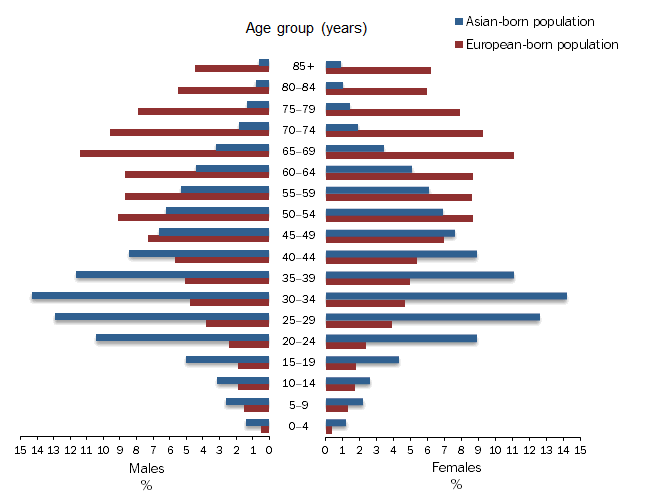 (b) Other Americas includes Central America, Caribbean and Americas, nfd. (c) Total includes Inadequately described, At sea, and North Africa and the Middle East, nfd. Source: Census of Population and Housing 2011, 2016 How do we compare with other countries? As of 2015, Australia had the 9th largest number of overseas-born people, higher than both Spain (10th) and Italy (11th).1 While the United States of America had the highest total number of people born overseas (47 million or 14% of their population),2 Australia had a higher proportion of overseas-born people, at 26%. Australia also had a higher proportion of people born overseas than our neighbour New Zealand (23%) and Canada (22%),3 other countries founded on migration. Proportion of population that are overseas migrants, 2015 Source: United Nations, Department of Economic and Social Affairs, Population Division, 'International Migration' in International migrant stock 20154 THE AGE AND SEX OF THE OVERSEAS-BORN POPULATION In 2016, the overseas-born population had a median age of 44 years compared with a median age of 34 years for the Australian-born population. This is influenced by the ageing of migrants who arrived under large-scale migration schemes following World War II. Age and sex distribution of the overseas-born and Australian-born populations, 2016 Source: Census of Population and Housing, 2016 Given the relatively recent increase in Asian migration, those born in Asia had a younger age profile with a median age of 35 years. By contrast, people born in Europe had a median age of 59 years. Age and sex distribution of the Asian-born and European-born populations, 2016 Source: Census of Population and Housing, 2016 THE ANCESTRIES OF AUSTRALIANS The ten most commonly reported ancestries were: