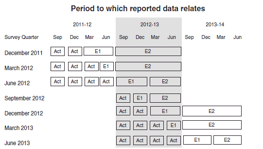 14 This survey cycle facilitates the formation of estimates of expenditure for financial years (12 months ending 30 June) which are presented in tables 5 and 6 of this publication. For example, as the previous table shows for 2011-2012: