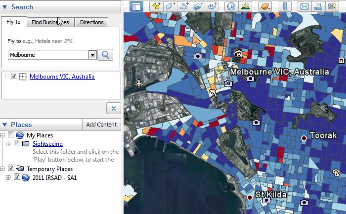 Some areas have a unique numerical code, such as SA1s, whilst others have both a code and a name, such as LGAs. You can search for a town or city you are interested in by entering the name in the "Fly to" box. If you know the specific code or name of the area you are searching for, another option is to click anywhere on the sidebar and press "Ctrl-F"; this will bring up a find box. Type in the code or name of the area you are looking for and press enter. When searching for SA1s in the SA1 level thematic maps, it is necessary to search for the 11-digit code, rather than the truncated 7-digit code. This should be done by opening the "Edit" menu and clicking "Find" and typing the SA1 11-digit code. The appropriate SA1 code will be highlighted, which can be clicked on to display it on the map. The correspondence between the 7-digit and 11-digit codes can be found in Table 7 of Statistical Area Level 1, Indexes, available from the Downloads tab. For information regarding why there are two SA1 codes, refer to "Why are there two SA1 codes?" on the FAQ page of the website. Previous Page | Next Page Document Selection These documents will be presented in a new window.