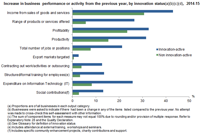 Almost a third (32%) of businesses reported a decrease in profitability compared to the previous year, while over a quarter of businesses reported an increase (28%). An increase in income from sales of goods or services compared to the previous year was reported by 36% of businesses, which is more than the proportion of businesses that reported a decrease (31%). An increase in income from sales of goods or services was reported by 62% of businesses with 200 or more persons employed, which is twice the proportion of businesses with 0-4 persons employed (31%). More than half of businesses with 200 or more persons employed reported an increase in profitability (51%). Transport, postal and warehousing was the only industry where a higher proportion of businesses reported a decrease in productivity (14%) and range of goods or services offered (8%) than an increase (13% and 7% respectively). In 2014-15, for each of the performance indicators provided, a higher proportion of innovation-active businesses reported an increase in at least one indicator or activity from the previous year than non innovation-active businesses. For example, the proportion of innovation-active businesses that reported an increase in range of products and services offered (26%) was more than four times the proportion of non innovation-active businesses (6%). Further statistics relating to change in business performance can be accessed via the Downloads tab. Barriers to general business activities Businesses were asked if any factors significantly hampered them in their general business activities or performance during the year ended 30 June 2015. It should be noted that businesses were not provided with a definition of what constituted a significant level of hampering and were not asked to rank barriers in order of significance.