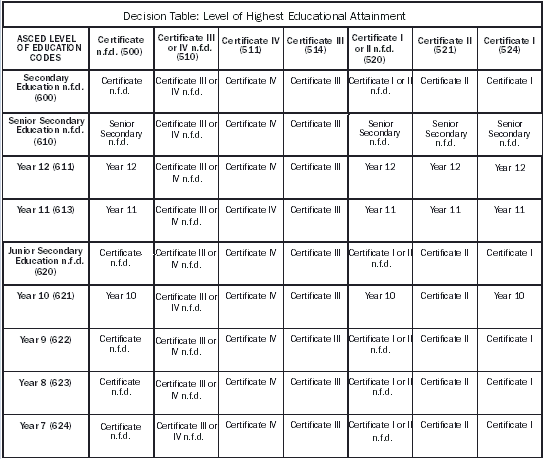 The decision table is also used to rank the information provided in a survey about the qualifications and attainments of a single individual. It does not represent any basis for comparison between differing qualifications. For example, a person whose Highest Year of School Completed was Year 12, and whose Level of Highest Non-school Qualification was a Certificate III, would have those responses crosschecked on the decision table and would as a result have their Level of Highest Educational Attainment output as Certificate III. However, if the same person answered 'Certificate n.f.d.' to the highest non-school qualification question, without offering any further detail, it would be crosschecked against Year 12 on the decision table as 'Certificate not further defined'. The output would then be 'Year 12'. The decision table, therefore, does not necessarily imply that one qualification is 'higher' than the other.