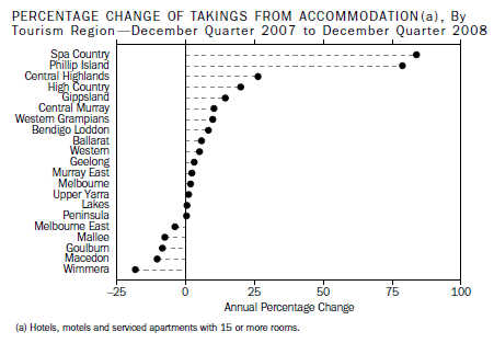 The highest percentage growth in accommodation takings between December quarter 2007 and December quarter 2008 was recorded in the Tourism Region of Spa Country (83.8%), followed by Phillip Island (78.7%) and Central Highlands (26.3%). The largest decreases in accommodation takings were recorded in the Tourism Regions of Wimmera (-18.1%), Macedon (-10.2%) and Goulburn (-8.4%).