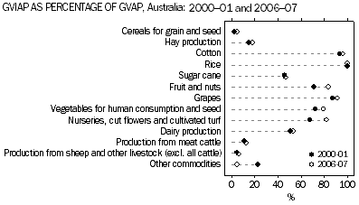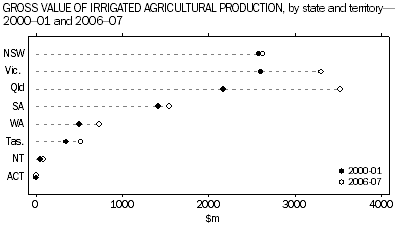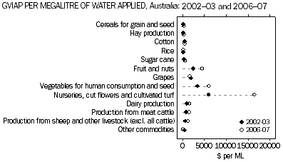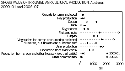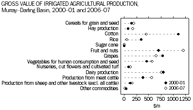 BACKGROUND There are some commodities for which the value of irrigated production contributes significantly to the total value of agricultural production. The entire value of rice production in Australia ($55 million in 2006-07) is produced under irrigation. The irrigated value of production from cotton, grapes, fruit and nuts, vegetables and nurseries, cut flowers and cultivated turf in 2006-07 accounted for 80% or more of total production for each of those products. In 2006-07, the ratio of GVIAP per megalitre of water applied varied greatly between commodity groups. The groups with the lowest ratio were rice ($230 per ML), other broadacre crops ($293 per ML), cereals for grain and seed ($331 per ML) and total hay production ($385 per ML). The groups with the highest ratio were nurseries, cut flowers and cultivated turf ($16,470 per ML), vegetables for human consumption and seed ($6,104 per ML) and fruit and nuts ($4,493 per ML). Over the period between 2002-03 and 2006-07 (note that Volume of Water Applied data were not collected in 2000-01 and 2001-02), many commodities showed only a slight increase in the GVIAP generated for each megalitre of water applied. However, some commodities showed large increases in the value of irrigated production per megalitre. The largest increase was for nurseries, cut flowers and cultivated turf, which went up from $6,005 per ML to $16,470 per megalitres (up 174% over that time period). Other commodities showing increases were vegetables (from $3,424 to $6,104) and fruit and nuts (from $2,550 to $4,493). It should be noted that the increase shown for nurseries, cut flowers and cultivated turf may also be as a result of improvements to collection methodology (see Explanatory Notes). The State which contributed the most to the value of irrigated production during 2006-07 was Queensland - $3,520 million or 29% of total GVIAP. During 2000-01 the value of irrigated production generated in Queensland was $2,172 million, which was 22% of the value of total irrigated production for Australia. Victoria’s contribution to total GVIAP was $3,303 million (or 27%) in 2006-07 compared with a similar proportion (27% or $2,601 million) in 2000-01. For New South Wales, the GVIAP in 2000-01 was $2,583 million or 27% of the total, however, the national share of irrigated production for New South Wales declined to 21% of the total GVIAP ($2,629 million) in 2006-07. Statistics for the Murray-Darling Basin (MDB) relating to irrigation are only available for 2000-01, 2005-06 and 2006-07. In 2006-07 the MDB had irrigated production to the value of $4,936 million, or 40% of Australia’s total value of irrigated production. In contrast the value of irrigated production in the MDB during 2000-01 was $5,085 million, or 53% of the total value of irrigated production for the nation at that time. Irrigated production in the MDB accounted for 39% of the total value of all agricultural commodities produced in the Basin in 2006-07. The commodities that contributed most to the value of irrigated production during 2006-07 in the MDB were fruit and nuts ($1,207 million or 24%), dairy production ($763 million or 15%) and grapes ($651 million or 13%). During 2000-01, cotton had been the commodity that contributed most to the total value of irrigated production ($1,111) or 22% of total GVIAP for the MDB. However by 2006-07 this commodity only accounted for $457 million or 9% of total GVIAP in the MDB. This is partly reflected in the decrease in the volume of water applied to cotton, with the volume decreasing from 1,574 GL in 2005-06 to 819 GL in 2006-07. Document Selection These documents will be presented in a new window.