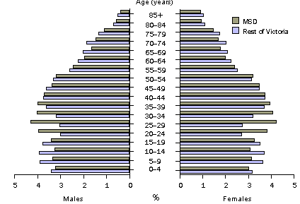 Final Issue - This publication is being replaced by Population by Age and Sex, Australia (Cat. No. 3235.2.55.001) Companion Data. GROWTH RATE, Statistical Divisions- Victoria (a) Average annual growth rate Victoria compared to Australia In June 2000, the Victorian population made up 24.9% of the Australian population. This proportion is consistent with that of 1995 and 1999, when Victoria made up 25.0% and 24.9% of the Australian population respectively. Age Structure The age distribution of the Victorian population is concentrated around the age range of 20-44 years. During the year to 30 June 2000, the largest increase was in the 50-54 years age group which increased by 10,400 (3.5%). The highest growth rate was in the 85 years-and-over age group at 5.7% followed by the 80-84 years age group at 5.0%. Within the 0-14 years age group, there were 4,800 less individuals aged 0-4 years (a decrease of 1.6% since 1999) and 3,867 more individuals aged 5-14 years (an increase of 0.6% since 1999). As a proportion of the Victoria population, the 0-14 years age group has decreased from 20.9% in 1995 and 20.1% in 1999 to 19.9% in 2000. The number of people aged 65 and over in Victoria in June 2000 increased by 10,100 (1.7%). As a proportion of the Victorian population, this age group continues to increase from 12.3% in 1995 and 12.7% in 1999 to 12.8% in 2000. The median age of Victorians has continued to rise from 34.0 years in 1995 and 35.1 years in 1999 to 35.3 years in 2000. This is slightly higher than the June 2000 preliminary median Australian age of 35.2 years. PERCENTAGE (a) OF POPULATION IN AGE GROUPS, Victoria (a) Percent of MSD population by age and sex, and percent of Rest of Victoria population by age and sex. Age Distribution by Statistical Division The Statistical Division with the highest proportion of persons in this age group was Mallee (22.7%) and the lowest proportion was in the MSD (19.1%). The MSD had the highest proportion of persons in the 15-29 years age group (23.0%) and Wimmera had the lowest proportion (16.2%). East Gippsland had the highest proportion of persons in the 30-64 years age group (46%) and the Central Highlands had the lowest (43.4%). Wimmera had the highest proportion of persons in the 65-84 years and 85 years-and-over age groups (15.8% and 2.3% respectively). The MSD had the lowest proportion of persons in the 65-84 years and 85 years-and-over age groups (10.8% and 1.3% respectively). Melbourne Statistical Division Population Growth The MSD SLAs with the strongest growth in the 12 months to 30 June 2000 were, Melton (S)- East (44.7%), Melbourne (C)- Inner (36.4%), Melbourne (C)- Southbank-Docklands (34.3%), and Wyndham (C) Bal (24.2%). The SLAs of Hume (C)- Craigieburn, Casey (C)- Berwick and Knox (C)- South also had strong growth at 9.5%, 8.6% and 6.8% respectively. Some MSD SLAs experienced a decline. Those which declined more than or equal to 0.2% include: Moreland (C)- Coburg which declined by 320 persons (0.7%), Moreland (C)- North by 280 persons (0.2%) Moreland(C)- Brunswick by 230 persons (0.6%), Banyule (C)- North by 250 persons (0.5%), Kingston (C)- North by 340 persons (0.4%), Moonee Valley (C)- West by 90 persons (0.2%) and Monash (C)- South-West by 90 persons (0.2%). HIGH GROWTH SLAS, Melbourne Statistical Division (a) Average annual growth rate Rest of Victoria Population Growth In the rest of Victoria during the 12 months to 30 June 2000, SLAs that experienced strong growth were Greater Bendigo (C)- Strathfieldsaye (5.8%), Surf Coast (S)- East (5.0%), Golden Plains (S)- North-West (4.9%), Mitchell (S)- South (4.2%), Colac-Otway (S)- South (4.1%) and Bass Coast (S)- Phillip Is. (3.8%). Those SLAs in the rest of the state that experienced a relatively strong decline were Buloke (S)- South by 130 (3.4%), Buloke (S)- North by 120 (3.3%), Wellington (S)- Rosedale by 240 (3.3%) and Towong (S)- Pt B by 120 (3.0%). SLAS WITH GREATEST GROWTH AND DECLINE, Rest of Victoria (a) Average annual growth rate Document Selection These documents will be presented in a new window.