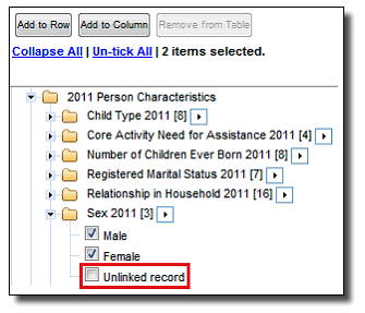 When using the weighted summation option in TableBuilder, no results will be returned for unlinked records in 2011 as weights were not applied to these records. Results will be returned if analysis is performed on unweighted data only. If desired, this category can be excluded from tables by ensuring that the 'unlinked record' category is deselected before each data item is added to the table. Such a table would produce a sample count corresponding to the equivalent table run with weights. Refer to the TableBuilder, User Guide (cat. no. 1406.0.55.005) for more information on how to select data items for tables.