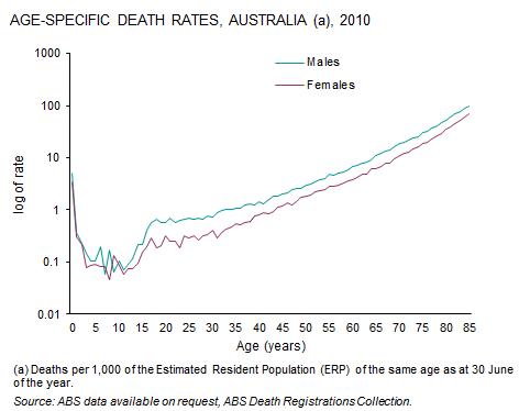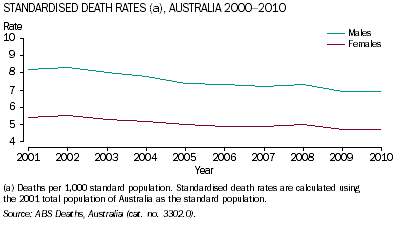 COMMENTARY DEATH RATES In 2010, the age standardised death rate for males was 6.8 deaths per 1,000 males, higher than 4.7 deaths per 1,000 for females. The age standardised death rates take into account both the differences between the age structures for males and females and the effect of changes in the age structure of the Australian population over time. Both male and female age standardised death rates in 2010 were lower than in 2001 (8.2 deaths per 1,000 males and 5.4 deaths per 1,000 females). While males had higher death rates than females in each of the ten years to 2010, the gap between male and female death rates narrowed from 2.8 deaths per 1,000 in 2001 to 2.1 deaths per 1,000 in 2010. The difference in the death rates for males and females is attributed to different attitudes, biology, behaviours, lifestyles and working patterns. Females, for example, are less likely to be overweight or to smoke, which reduces the risk of some cancers, cardiovascular disease and diabetes. Males are more often involved in hazardous occupations and are more prone to risky behaviours, particularly in early years of adult life, which together result in higher death rates due to accidents. (Endnote 1) Over the last 125 years there have been changes in what Australians have died from and the age at which they have died. Up until 1932, infectious and parasitic diseases caused at least 10% of all deaths each year, with death rates from these diseases highest among the very young and very old. (Endnote 2) Improvements in living conditions in the early 20th century, such as better water supplies, sewerage systems, food quality and health education, led to lower death rates and longer life expectancy at all ages. (Endnote 3) Advances in medical technology, public health measures (including earlier detection of some illnesses) and healthier lifestyles have contributed to declines in the standardised death rates from some of the leading causes of deaths. Age-specific death rates Following relatively high death rates in infancy, death rates decline sharply through childhood ages. In 2010, male and female children aged 5-9 years and 10-14 years had the lowest age-specific death rates (ASDRs) (0.1 per 1,000 children of these ages). ASDRs begin to rise from age 15 years. In 2010, the ASDR for male children in the 15-19 years age group was 0.5 per 1,000, and for female children in this age group it was 0.2 per 1,000. For all older age groups, ASDRs were higher for males than females. Male ASDRs increased gradually across age groups until around the 40-44 years age group, after which they increase more quickly through the older age groups. ASDRs for females in the age groups from 15 to 39 years were relatively low, but continued to rise through the older age groups. Death rates have declined between 2001 and 2010 for both males and females for most ages. The largest proportional declines have occurred in the younger age groups. For children aged under 1 year the ASDR for males has declined from 5.8 to 5.0 (down 14%), and for females the decline was from 4.5 to 3.5 (down 22%). ASDRs have also declined in the older age groups, with the ASDR for males aged 80-84 years declining from 80.4 in 2001 to 67.6 in 2010 (down 16%) and for females from 52.9 to 45.8 (down 13%).Leading causes of deaths Ischaemic heart disease was the leading causes of death for both males and females in 2010, with 11,704 and 10,004 deaths respectively. This reflects a sex ratio of 117 male deaths per 100 female deaths. The remaining leading causes of death vary between the sexes, in part due to the incidence of gender-specific diseases, such as prostate or ovarian cancer. However, other causes which may not be gender specific also showed variance between the sexes. In 2010, Trachea and lung cancers deaths for males were 4,932 compared to 3,166 deaths for females (sex ratio of 156 male deaths for every 100 female deaths). Strokes were the second leading cause for female deaths and third leading cause for male deaths with 6,871 and 4,333 deaths respectively (sex ratio of 63 male deaths for every 100 female deaths). In 2010, males accounted for 77% of Suicide deaths and 58% of Blood and lymph cancer deaths. Females accounted for 68% of all deaths from Dementia and Alzheimer's disease and 57% of all deaths from Heart failure. (Endnote 4) Burden of disease The burden of disease provides an insight into the loss of health and wellbeing of Australians due to premature mortality, disability and other non-fatal events. Disability-Adjusted-Life-Year (DALY) is a measure used to combine information on mortality, disability and other non-fatal health outcomes. It describes the amount of time lost due to both fatal and non-fatal events, that is, years of life lost due to premature death coupled with years of ‘healthy’ life lost due to disability. DALY gives a more complete view of the health of the population. In 2003, more than 2.63 million years of ‘healthy’ life (that is, DALYs) were lost due to the burden of disease and injury in Australia. Out of these, the burden was shared relatively equally by males and females (52% and 48% respectively). Overall, half the total burden (49%) was due to premature deaths, and the distribution between the sexes was roughly equal for most causes, with the exceptions being injuries (70% of the burden for males) and musculoskeletal disorders (58% of the burden for females). Cancer, cardiovascular disease and mental disorders were the leading causes of total burden of disease and injury in Australia. The burden experienced as a result of ischaemic heart disease was 11% of the total burden for males and 9% of the total burden for females. This has decreased since 1993 when the burden experienced as a result of this disease was 15% of the total burden for males and 12% of the total burden for females. Cancer has remained a relatively stable contributor to the total burden of disease. In 2003, breast cancer contribu
