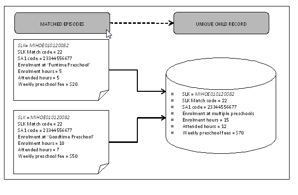 Where two or more child episodes are linked, the unique characteristics within each episode are used to formulate the characteristics of the corresponding unique child record. Figure 3.11 outlines two linked episodes from two different preschool programs with weekly preschool fees, enrolment and attendance hours. This information is used to create a unique child record from the same data source supplied for the Collection. Figure 3.11 Child Episode Record to Unique Child Records