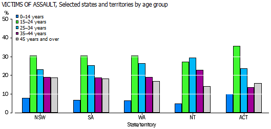 SEX AND AGE In New South Wales, South Australia and the Australian Capital Territory, males were more likely than females to be victims of assault. In New South Wales, 55% (39,307) of assault victims were male and 45% (31,760) of assault victims were female. In South Australia, 53% (8,577) of assault victims were male and 47% (7,666) of assault victims were female. In the Australian Capital Territory, 57% (1,263) of assault victims were male and 43% (958) of assault victims were female.