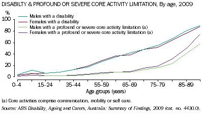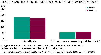 COMMENTARY LIVING WITH A DISABILITY Four million people in Australia (18.5%) were reported as having a disability in 2009, with males and females being reported as having similar overall rates of disability (18% and 17% respectively). For 5 to 14 year olds, rates of disability and rates of profound or severe core activity limitation for males were 11% and 7% respectively, close to double those for females in the same age group (6% and 3% respectively). Disability is defined as any limitation, restriction or impairment which restricts everyday activities and has lasted, or is likely to last, for at least six months. Of these everyday activities, being able to care for oneself (self care), being mobile (mobility) and being able to communicate with others (communication) are regarded as essential everyday tasks and are therefore called core activities. People classified as having a profound or severe core activity limitation are those who require help some or all of the time with at least one of these core activities. Disability can occur at any stage of a person's life and, depending on when it occurs, may affect an individual's participation in a range of everyday activities. DISABILITY PREVALENCE The age standardised disability rate in 2009 was 18.1% for males compared to 17.3% for females. The age standardised disability rates have fallen by two percentage points since 2003 for both males and females (down from 20.4% and 19.1% respectively). Much of the decrease in the prevalence of disability during this period, for both males and females, has been due to the decline in the proportion of people disabled by physical health conditions, such as asthma and heart disease. (Endnote 1) PROFOUND OR SEVERE CORE ACTIVITY LIMITATION The age standardised rate of profound or severe core activity limitation in 2009 was much the same for males (5.3%) and females (5.7%). These rates declined from 5.8% for males and 6.5% females in 2003. The prevalence of disability is strongly correlated with age, with rates of disability increasing to 90% for males and 88% for females aged 90 years and over in 2009. There are not many differences between the proportion of males and females reporting disability across age groups in 2009, except for the 5-14 year age group, where the proportion of males reporting disability (11%) was almost double the proportion of females in that age group (6%). As with disability prevalence, the proportion of people reporting profound or severe core activity limitation generally also increased with age. While the prevalence of disability has decreased from 2003 to 2009 for both males and females, the decrease was particularly noticeable in some age groups. In 2003, 9% of both males and females reported disability in the 15-24 year age group, whereas in 2009 the proportions fell to 7%. Similarly, 22% of both males and females reported disability in the 45-54 year age group in 2003, compared with 17% of males and 19% of females in the same age group in 2009. The proportions of females reporting profound or severe core activity limitation also declined across all age groups between 2003 and 2009. For males during this period, the proportions with profound or severe core activity limitation declined in most age groups, and there were no age groups with statistically significant increases. In 2008, the age standardised disability rate for both Aboriginal and Torres Strait Islander males and females aged 15 years and over and living in non-remote areas only was nearly 60%, which was higher than that for the total Australian population (nearly 20%). The age standardised rate of profound or severe core activity limitation for both Aboriginal and Torres Strait Islander males and females aged 15 years and over (living in non-remote areas) was also higher (10% for both males and females) than that of the total Australian population ( 5% for males and 6% for females). ENDNOTES 1. Australian Bureau of Statistics, 2010, Disability, Ageing and Carers, Australia: Summary of Findings, 2009 (cat. no 4430.0), <www.abs.gov.au>. HEALTH LINKSGlossary Data Cubes Document Selection These documents will be presented in a new window.