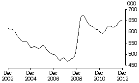 UNEMPLOYED PERSONS TREND ESTIMATES FEMALES The trend estimate of unemployed females generally fell from 271,500 in December 2002 to 228,800 in February 2008. The trend then rose to 292,000 in September 2009, before falling to 283,000 in February 2010. The trend has since risen to 297,600 in May 2012 before falling to 294,500 in December 2012. PERSONS The trend estimate of unemployed persons generally fell from 615,600 in December 2002 to 468,300 in March 2008. The trend then rose to 674,700 in June 2009 before falling to 592,900 in March 2011. The trend has since generally risen to 653,800 in December 2012. Document Selection These documents will be presented in a new window.