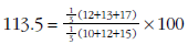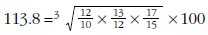 In order to have expenditure weights summing exactly to unity, the weight for clothing has been derived as a residual. The following illustrate the index number calculations: Laspeyres (0.4310 x 1.1000) + (0.1293 x 1.3333) + (0.0776 x 1.4444) + (0.2586 x 0.6667) + (0.1035 x 1.1000) x 100 = 104.5 Paasche 1/((0.4532 x 1.1000) + (0.1483 x 1.3333) + (0.0696 x 1.4444) + (0.2472 x 0.6667) + (0.0817 / 1.1000)) x 100 = 98.4 Fisher (104.500x98.400)1/2 Törnqvist best calculated by first taking the logs of the index formula (1/2) x (0.4310+0.4532) x ln(1.1000) + (1/2) x (0.1293 + 0.1483) x ln(1.3333) + (1/2) x (0.0776 + 0.0696) x ln(1.4444) + (1/2) x (0.2586 + 0.2472) x ln(0.6667) + (1/2) x (0.1035 + 0.0817) x ln(1.1000) = 0.015422 and then taking the exponent multiplied by 100 = 101.6.