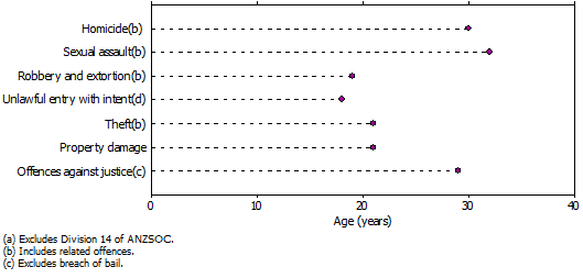 Based on the median age of offenders by each principal offence type, offenders were younger for the offences of unlawful entry with intent (median age 18 years), robbery (median age 19 years) and theft and property damage (median age of 21 years for both offence types). Offenders were older for the more serious offences of sexual assault (median age 32 years), homicide (median age 30 years) and fraud and offences against justice/government (median age 29 years for both offence types).