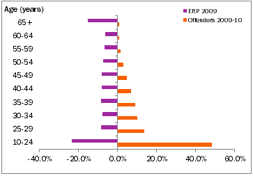 By comparing the proportion of total offenders who were aged between 10 and 24 in 2009-10 (48.5%) with the proportion of the general population who were aged between 10 and 24 in Australia as at December 2009 (23.5%) (