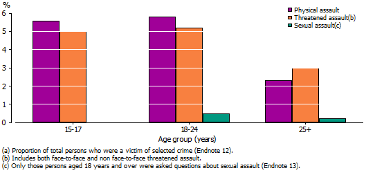 Physical assault was the most common form of assault experienced by the youth population in 2009-10. In the 12 months prior to interview, 5.6% of persons aged between 15 and 17 years old and 5.8% of persons aged between 18 and 24 years old experienced at least one physical assault. These rates are more than double the estimated victimisation rates for physical assault for persons aged 25 years and over (2.3%).