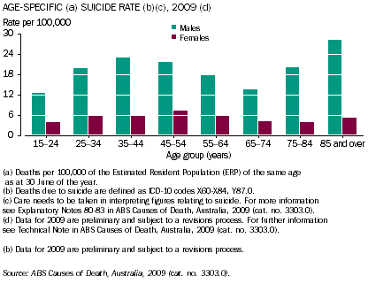 COMMENTARY SUICIDES Of all deaths classified as suicide in 2009, over three-quarters (77%) were males (2,132), making suicide the 10th leading cause of death for males. Male suicide occurs at a much higher rate than that for females. In 2009, the age standardised male suicide rate was 14.9 deaths per 100,000 males compared to the female rate of 4.4 deaths per 100,000 females. However, the data for 2009 are subject to revision. The suicide death rate has declined since 2000 from 19.8 deaths per 100,000 for males and 5.2 deaths per 100,000 for females. Suicide is a major social and public health issue. (Endnote 1) While such deaths can occur for many reasons, and many complex factors might influence a person’s decision to suicide, these preventable deaths point to individuals who may be less connected to support networks. (Endnote 2) For instance, they may be less inclined to seek help or may be less intimately connected to people who might otherwise be aware of problems or step in to assist. (Endnote 3) Age standardisation is used to compare death rates over time, as it accounts for any changes in the age structure of a population over time. Age standardised death rates enable the comparison of death rates between populations with different age structures by relating them to a standard population. The age standardised death rates in this analysis have been calculated using the direct method (used when the populations under study are large), which calculates the overall death rate that would have prevailed in the standard population if it had experienced, at each age, the death rates of the population under study. Care needs to be taken in using and interpreting figures relating to suicide as the reported number of suicide deaths may be affected by the number of open coronial cases with insufficient information available for coding at the time of ABS processing for publication. For further information, and how deaths are classified as suicide by the ABS, see Explanatory Notes 80-83 in ABS Causes of Death, Australia, 2009 (cat. no. 3303.0). Median age The median age at death for suicide in 2009 was 43.4 years for males and 44.9 years for females. In comparison, the median age for deaths from all causes in 2009 was 77.8 years for males and 83.9 years for females. (Endnote 4) Age-specific suicide death rates Age-specific death rates are the number of deaths during the reference year at a specified age per 100,000 of the estimated resident population of the same age (see Health Glossary for further information). The age-specific suicide rate was higher for males across all age groups, with the oldest group (85 years and over) having the highest suicide rate (28.2 per 100,000) in 2009. The suicide rate for this 85 years and over age group has declined significantly from 46.4 deaths per 100,000 in 2000. Middle aged males aged 35-44 years and 45-54 years had higher suicide rates (22.8 and 21.6 deaths per 100,000 respectively) than did younger males or those aged 55-84 years. For females, the highest age-specific suicide death rate in 2009 was in the 45-54 year age group, with 7.2 deaths per 100,000, while the lowest rate for female suicides was in the 15-24 year age group (3.9 deaths per 100,000). The suicide rate was higher for young males than young females. In 2009, males aged 15-24 years had a rate of around 12.5 suicides per 100,000 compared to 3.9 suicides per 100,000 for females aged 15-24 years. ENDNOTES 1. Australian Bureau of Statistics, 2000, Australian Social Trends, Mar 2000 (cat. no. 4102.0) <www.abs.gov.au>. 2. Organisation for Economic Cooperation and Development (OECD) 2001, Society at a Glance: OECD Social Indicators, OECD, Paris, <www.oecd.org>. 3. Australian Bureau of Statistics, 2010, Measures of Australia's Progress, 2010 (cat. no. 1370.0) <www.abs.gov.au>. 4. Australian Bureau of Statistics, 2011, ABS Causes of Death, Australia (cat. no. 3303.0), ABS, Canberra, <www.abs.gov.au>. HEALTH LINKS Glossary Data Cubes Document Selection These documents will be presented in a new window.