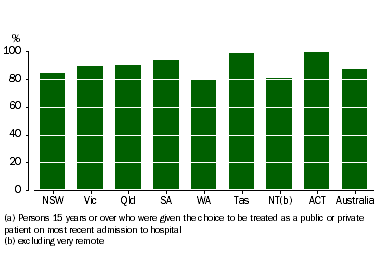 Information to assist choice of being treated as public or private patient Of the people who were given the choice to be treated as a public or private patient, approximately 87% (783,400 people) reported feeling they had been given enough information to choose. Men were more likely than women to report this (92% and 85% respectively). Across the States and Territories, people living in WA (79%) were the least likely to report being given enough information to choose, while nearly all people living in the ACT (100%) and Tasmania (99%) felt they were given enough information, shown in Figure 4.4 below. 4.4 Felt was given enough information to choose to be treated as public or private patient (a), by State/Territory (See Table 4.3 for more detail) Less people in areas of least disadvantage reported receiving enough information to make a choice about being treated as a public or private patient than people in areas of more disadvantage (80% compared with, for example, 92% of people in the middle quintile of the index of disadvantage). While people with private health insurance had been given the choice to be treated as a public or private patient more often than people without private health insurance, they were less likely to feel they had been given enough information to make the choice (84% and 93% respectively). Employed people were less likely to feel that they had been given enough information to choose (83%) than people who were unemployed or not in the labour force (92%) (see Table 4.1 for more detail).