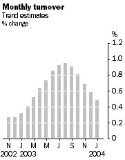 • The trend estimate of turnover for the Australian Retail and Hospitality/Services series increased by 0.5% in January 2004 compared with December 2003. This follows increases of 0.6% in December 2003 and 0.7% in November 2003.