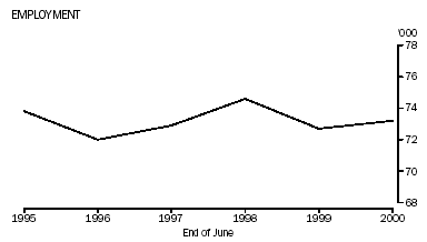 Western Australian manufacturing employment decreased from June 1995 (73,800 persons) to June 1996 (72,000 persons), after which it recovered by June 1998 (74,600 persons). Manufacturing employment in Western Australian manufacturing industry then fell by June 1999 (72,700 persons), only to increase again between June 1999 and June 2000 (73,200 persons). Over the five years from June 1995 to June 2000, employment fell by 0.8% or 600 persons.
