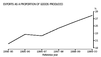 For 1999-2000, Western Australian manufacturers directly exported $4,728m of the goods that they produced. This represents a 11.9% increase on the $4,223m recorded for 1998-99. The percentage of total sales and transfers out of goods produced that were exported also increased (from 26.2% for 1998-99 to 27.9% for 1999-2000). There has been an increase of 7.7 percentage points in this proportion since 1994-95 (when the proportion was 20.1%).