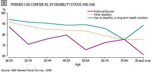As can be seen in Graph 4, whether a person with a profound or severe disability has family they can confide in fluctuates through the life cycle, peaking in their old age.
