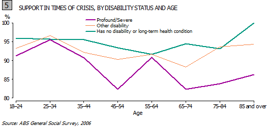 Whether people with disability have someone to support them in a time of crisis fluctuates throughout the life cycle, peaking in young adulthood and again in the period from 55-64 yrs. People with profound or severe disability are generally less likely to report having these forms of support throughout their life cycle, compared to people without disability, although they do approach the same rates at ages 25 to 34 years and 55 to 64 years (see Graph 5).