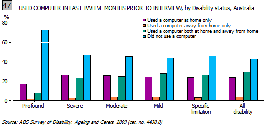People with profound core activity limitations were less likely than people with less severe disabilities to have used a computer (Graph 47) or accessed the Internet in the twelve months prior to interview, than people with less severe disabilities. |