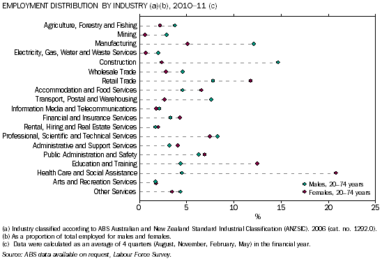 COMMENTARY LABOUR FORCE In 2010-11, males aged 20-74 years had a higher labour force participation rate (80%) than females in the same age group (65%). The labour force participation rate for males has remained steady between 2001-02 and 2010-11, while it has increased by five percentage points for females during this period, with most of the increase achieved in the older age groups. The labour force participation rate was higher for males than females across all age groups. The 20-74 year age group has been chosen as the key broad population of interest for a number of reasons. Those in the 15-19 year age group are more likely to be working part-time and/or studying and not yet moved into the labour force on a full-time basis. The increased life expectancy of Australians, and the much longer years of life after age 64 years, is also seeing increasing rates of employment for people over 64 years of age. Since 2001-02 the labour force participation rate for men aged 65 -74 years has increased from 15% to 24%, while for women it has more than doubled from 6% to 13%. The labour force comprises of people who are either employed or unemployed (i.e. actively looking for and available for work). The labour force participation rate for any group within the population is the labour force component of that group, expressed as a percentage of the total population in that group (the sum of the labour force component and those people neither working nor looking for work). Increasing the Australian working-age population, lifting labour force participation rates, and raising productivity have been identified by the Australian Treasury as critical in addressing the economic challenges posed by an ageing population (Australian Treasury 2010). While there is an economic incentive to lift labour force participation rates, there are also benefits to the individual. Labour force participation can lead to greater individual wellbeing in terms of financial security, self-esteem and social engagement. (Endnote 1) The labour force participation rate for males has historically been much higher than the rate for females. However, a range of cultural and economic shifts in recent decades has seen a dramatic increase in the proportion of females participating in the labour force. (Endnote 2) Much of the increase in the labour force participation of females is associated with part-time work. A more detailed analysis on part-time employment is included in the Employment Conditions commentary. The labour force participation rate for both males and females varies over the life course. The rate for males remains relatively high until men reach their sixties when many retire. For males, participation rates peak in the 25-44 year age group, while for females, the participation rates peak in the 45-54 year age group. For females, the labour force participation rate tends to dip slightly during the peak childbearing years between the ages of 25 and 44 years. Delayed childbearing and an increased propensity for females to combine paid work and family has seen this dip become later and less pronounced than in the past. In 2010-11, the labour force participation rate for females in the 20-24 year age group was 76%, and for the 25-34 year age group it declined to 73%. The participation rate for females in the 35-44 year age group was 75% and then it increased to 78% for the 45-54 year age group. The labour force participation rates for males in the 20-54 age groups have remained relatively stable from 2001-02 to 2010-11, but increased for males in the 55-64 and 65-74 years age groups (eleven and nine percentage points respectively) over this period. For females, while there has been an increase in labour force participation rates across all age groups in the same period, the largest gain has been in the older age groups. For females aged 55-64 years it was 16 percentage points. During this period, the labour force participation rate for females aged 45-54 and 65-74 years each increased by seven percentage points. Labour force participation rate for parents The labour force participation rate is notably lower for females with dependent children than for their male counterparts, as they are most likely to be the ones to shift into the role of primary carer of children at this stage in life. The labour force participation rate for mothers is partly related to the age of their child/ren, with participation increasing as the age of their youngest child increases. In 2010-11, the difference in the participation rate between males and females whose youngest child was aged 5 years or under was 39 percentage points, but drops to a 14 percentage point difference when the youngest dependent child is aged 6-14 years. EMPLOYMENT TO POPULATION RATIO Measuring changes between employment levels and population levels enables evaluation of the strength of employment growth compared with population growth. The measure relating these two levels is the employment to population ratio. Movements in the employment to population ratio reflect changes in the number of employed people relative to changes in population size. Being employed affects income, living standards, welfare dependency, social inclusion and social connectedness, and through them, social and economic wellbeing, for both individuals and their family members. (Endnote 3) There is a level of interdependence between labour force participation rates and employment to population ratios. For example, one cannot be employed without also being classified in the labour force. In addition, an economic slow-down may not only result in a decline in employment levels, but also contribute to a decline in overall labour force participation as unemployed people may become disheartened and disengage from the search for work. It is therefore not surprising that these two measures might move with some level of unison. Employment patterns of males and females have changed over time. The proportion of em