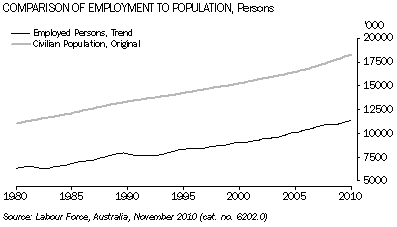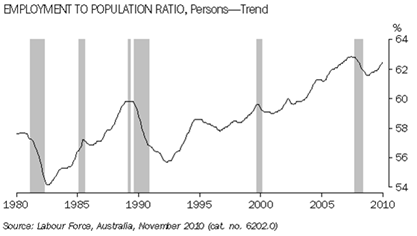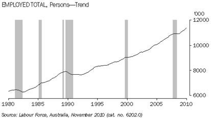 This article presents trend data and describes each of these measures and their use in understanding movements in Australia's labour market. Employment The ABS releases the count of the number of people employed each month in the measure, total employed persons. The number of employed persons in Australia has generally risen since the last major economic downturn in the early 1990s. Since 1978, the largest fall in employment occurred at this time, between June 1990 and December 1992, falling from 7,910,800 employed persons to 7,637,300, a decrease in employment of 273,500 persons (3.5%). For graphs in this article, the shaded areas indicate quarters where the percentage change in Gross Domestic Product (GDP - Chain Volume measure, Trend) was less than or equal to +0.2%, indicating the periods of slowing or declining economic growth. Source: Australian National Accounts: National Income, Expenditure and Product (cat. no. 5206.0). All graphs end at November 2010, to coincide with the latest available data. Employment to Population Ratio The ratio of the number of employed persons to the civilian population, termed the employment to population ratio, is a measure that removes the influence of population growth from the level estimates, revealing the underlying month-to-month movements in the employed proportion of the civilian population. This measure allows for better comparability of Australia's employment characteristics across time. The two largest declines in the employment to population ratio occurred during the early 1980s and 1990s. Between July 1981 and June 1983, the employment to population ratio fell 3.5 percentage points, from 57.7% to 54.2%, and between December 1989 and February 1993 it fell 4.0 percentage points, from 59.8% to 55.7%. The third largest fall occurred during the most recent downturn where the employment to population ratio decreased 1.3 percentage points, from the highest recorded rate of 62.8% in May 2008, to 61.6% in August 2009. During the same period, this decrease was not reflected in the measure of total employed persons, due to the effects of population growth. Interestingly, the lowest point of this recent downturn still remained higher than any point during all of the prior economic cycles (between February 1978 and April 2006).