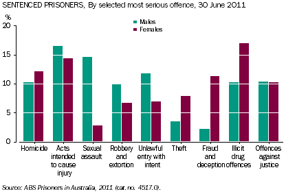 At 30 June 2011, the highest proportion of sentenced male prisoners were sentenced for acts intended to cause injury (17%) as the most serious offence, followed by sexual assault (15%). For sentenced female prisoners, the highest proportion were sentenced for illicit drugs (17%) as the most serious offence, followed by acts intended to cause injury (14%). However, the overall number of females sentenced for illicit drugs (260) was lower than males sentenced for this offence (2,140).