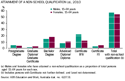 COMMENTARY ATTAINMENT OF A NON-SCHOOL QUALIFICATION In 2010, a little over 60% of young men and women aged 25-29 years had attained a formal qualification at the Certificate level III or above. However, the proportion of women who had attained a Bachelor Degree or above (38%) was higher than for men (30%). Education contributes to economic growth and improves individual wellbeing. Higher levels of educational attainment are associated with increased employment opportunities and higher wage rates. (Endnote 1) Attainment of a non-school qualification (vocational or higher education qualification) also has a number of benefits. It allows individuals to engage with society, and may lead to fulfilling and rewarding careers. (Endnote 2) ATTAINMENT OF A FORMAL QUALIFICATION AT CERTIFICATE III OR ABOVE The formal qualification at Certificate III or above includes attainment of a Certificate III, Certificate IV, Diploma, an Advanced Diploma, Bachelor Degree, Graduate Diploma, Graduate Certificate, or Postgraduate Degree. The changes over time in male and female attainment of a formal qualification at the Certificate level III or above may be a good indicator of how gender roles are changing over time in Australia. From 2001 to 2010, the proportion of females aged 25-29 years attaining a qualification at Certificate III or above rose 17 percentage points compared to a rise of 11 percentage points for males. For the 30-34 year age group the proportion of women who had attained a formal qualification at Certificate III or above was 64% in 2010, up from 41% in 2001, while for men the proportion rose from 53% in 2001 to 62% in 2010.