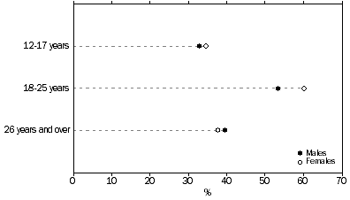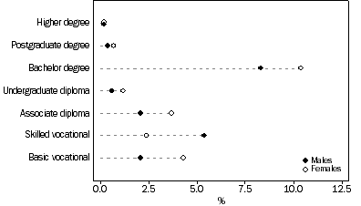 The proportions of young people aged 12-17 (92%) and 18-25 years (43%) attending educational institutions were above the national proportions of 87% and 30% respectively, and were higher than any other State or Territory. Given the legal age requirement for school attendance, education participation rates were highest for the younger age groups. Almost all (96%) of those in the 12-14 years age group reported that they were still at school, with the majority of these (60% or 8,039) attending government schools. Among 15-17 year-olds, educational participation remained high, with 84% at school and 5% in post-secondary education. Non-main English-speaking birthplace Participation in education was very high among young people born overseas in a non-main English-speaking country. Almost three-quarters (74%) of them were attending an educational institution. This was much higher than the general level of educational participation for young people (62%) and suggests the presence of an overseas student population. Almost 29% of young people born overseas in a non-main English-speaking country reported attending a university or tertiary institution, compared with 17% of all young people in the Australian Capital Territory. Indigenous people Among Indigenous young people aged 12-25 years, 49% (426) were attending an educational institution in 1996. Most of the participation was in the younger age groups, with 91% of 12-14 year-olds and 59% of 15-17 year-olds in education. Just 9% of all Indigenous young people in the Australian Capital Territory reported attending a university or other tertiary institution. Education and labour force status Many young people attending educational institutions were also employed. Among 15-25 year-olds who were attending a tertiary or other institution in 1996, 59% were employed either full-time (22%) or part-time (35%). Among young people attending a tertiary or other institution full-time, 38% (32% in 1991) were also working part-time. Qualifications In the five years from 1991 to 1996, the proportion of 15-25 year-olds with post-secondary qualifications increased from 16% to 21%. Among persons aged 26 years and over, the proportion increased from 44% to 48% over the same period. Young people in the Australian Capital Territory were also more highly qualified in 1996 than five years earlier. Among those young people holding post-school qualifications, the proportions who had attained a bachelor degree or higher increased from 40% to 44%. Among all 15-25 year-olds in 1996, a higher proportion of females than males held post-school qualifications (23% compared with 19%). The qualifications most commonly held by young females were bachelor degrees (10%), followed by basic vocational qualifications (4%). The most common qualifications among young males were bachelor degrees (8%), followed by skilled vocational qualifications (5%).