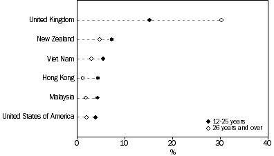 Among young people in the Australian Capital Territory who arrived in Australia prior to 1986, the highest proportion had been born in the United Kingdom (22%), followed by those born in New Zealand (7%). Among those who arrived between 1986 and 1990, the highest proportion were born in the United Kingdom (13%), New Zealand (7%), and Hong Kong and Viet Nam (6% each). Among those who arrived more recently (1991-96), only 17% were born in one of the main English-speaking countries. However, the highest proportion (8%) were born in New Zealand, followed by 6% each from Hong Kong and Viet Nam, and 5% from India.