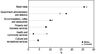 Main Findings Labour force status In the Australian Capital Territory at the time of the 1996 Census, there were 38,402 15-25 year-olds in the labour force; that is, they were either employed or looking for work. They made up 24% of the total labour force (161,219 people), down from 25% of the total labour force in 1991. The majority (86%) of these young people were employed. Participation rates The labour force participation rate for young people in 1996 was 67%. Participation among Indigenous young people was lower at 58%, and among young people born overseas in a non-main English-speaking country, the participation rate was 46%. This reflected the much higher level of educational participation by this group. Between 1991 and 1996 the male participation rate fell from 68% to 67%, whereas the female participation rate rose from 66% to 67%. Full-time work The proportion of young people employed in full-time work fell between 1991 and 1996 from 34% to 30%. This decrease was experienced by both young females and males and reflected the general move in the labour force from full-time to part-time work, especially for young people. Part-time work The proportions of both young and older people employed in part-time work have increased. Between 1991 and 1996, the proportion of young people in the Australian Capital Territory who were employed part-time increased from 21% to 26%, and for older people, from 16% to 17%. Among the 15-25 year-olds who were employed, 51% of young females, and 38% of young males, were employed part-time. Unemployment In 1996, the unemployment rate for young people in the Australian Capital Territory was 14%, that is, 14% of 15-25 year-olds in the labour force reported that they were looking for work. Among young males, the rate was 16%, compared with 12% for young females. Another measure of unemployment among young people, which takes account of the varying labour force participation between age groups, is the proportion of the total population in the age group who were unemployed. In the Australian Capital Territory in 1996, fewer than 7% of 15-17 year-olds were looking for work. Among other age groups, this proportion was almost 13% for those aged 18-19 years, 10% for 20-24 year-olds, and 7% for 25 year-olds. Among all 15-25 year-olds, 9% were unemployed. Industry In 1996, the leading industries of employment for both young males and females were Retail trade (26% and 27%); Government administration and defence (17% and 14%); and Accommodation, cafes and restaurants (10% and 11%).