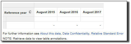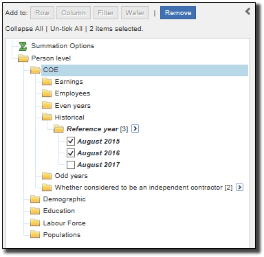 FILE STRUCTURE AND CONTENT FILE STRUCTURE Reference Year The COE TableBuilder contains a mandatory field called Reference year to allow for historical analysis. By default this field will be present in any new table as per the image below: Individual years can be removed from the table using the data item panel by selecting the required year and removing it from the table as per the image below: However, at least one category (reference period) of the mandatory field must be present in a table for TableBuilder to retrieve data. Biennial Content The COE TableBuilder contains biennial content, distinguished by odd and even years in the Data items list as per the image below: When a data item is placed in a table and was not applicable for a particular reference year, TableBuilder will return a "Not applicable" reference. Where data is requested for multiple years for a biennial item, TableBuilder will retrieve data at the applicable reference year and return "Not applicable" for the year that the data item was not collected. Not Applicable Categories Most data items included in the TableBuilder file include a 'Not applicable' category. The classification values of these 'Not applicable' categories, where relevant, are shown in the data item list in the Downloads tab. The 'Not applicable' category generally represents the number of people who were not asked a particular question or the number of people excluded from the population for a data item when that data were derived (e.g. Status of employment in second job is not applicable for people without a second job). Table Populations The population relevant to each data item is identified in the data item list and should be kept in mind when extracting and analysing data. The actual population count for each data item is equal to the total cumulative frequency minus the 'Not applicable' category. Generally, some populations can be 'filtered' using other relevant data items. For example, if the population of interest is 'Employees', any data item with that population (excluding the 'Not applicable' category) could be used. Zero Value Cells Tables generated from sample surveys will sometimes contain cells with zero values because no respondents that satisfied the parameters of a particular cell in a table were in the survey. This is despite there being people in the general population with those characteristics. This is an example of sampling variability which occurs with all sample surveys. Relative Standard Errors cannot be generated for zero cells.