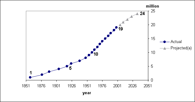 Australia's population reaches 19 million Australia's population has reached 19 million. In commenting on the Australian Bureau of Statistics' figure, the Minister for Financial Services and Regulation, The Hon. Joe Hockey, described it as a "significant milestone for the nation". Minister Hockey said it had taken four years and five months for the population to increase from 18 to 19 million. During that time, natural increase contributed 53% and net overseas migration contributed 47% to population growth. "The latest ABS population projections suggest that it will take six years to add the next million people to Australia's population, and that growth will continue to slow down as natural increase falls and migration levels remain steady," the Minister said. "At the turn of the century, on the threshold of nationhood, Australia's population was only four million, but even then the impact of migration was evident, with 23% of the population born overseas, the same proportion as today. "Since 1949, when Australia's population was eight million, it has taken between four and five years for each successive million people to be added to the population. The relative contribution of natural increase and net overseas migration to each successive million has varied quite considerably over this period." Minister Hockey said the reality of population change affected Australia almost every moment of the day. "The Australian Bureau of Statistics estimates that every day, on average, the population grows by 558 people - 681 babies are born, 369 people die and 246 migrants are added." Minister Hockey was speaking at the unveiling of an Australian Bureau of Statistics 'Population Clock'. AUSTRALIA'S POPULATION GROWTH (a) Series K projection from ABS Population Projections 1997 to 2051 (Cat No 3222.0) AUSTRALIA'S POPULATION GROWTH - TIME BETWEEN SUCCESSIVE MILLIONS