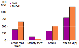 SNAPSHOT OF PERSONAL FRAUD VICTIMS OF PERSONAL FRAUD BY FRAUD TYPE, 2007 and 2010-11 (a) Persons may have been a victim of more than one fraud type so components may not add to total. Australians lost $1.4 billion in 2010-11 due to personal fraud. Three in five victims of personal fraud (60% or 713,600 persons) lost money, an average of $2,000 per victim who incurred a financial loss. The median loss for personal fraud was $300. This means that half the number of people who lost money due to personal fraud lost less than $300 and half lost more than $300. IDENTITY FRAUD In the 12 months prior to the survey, an estimated 702,100 Australians were victims of identity fraud, or 4.0% of the population aged 15 years and over. This is an increase from the 499,500 victims of identity fraud in 2007 (3.1%). CREDIT CARD FRAUD An estimated 662,300 Australians aged 15 years and over were victims of credit card fraud in the 12 months prior to interview, or 3.7% of the population aged 15 years and over. This is an increase from the 383,300 victims of credit card fraud in 2007 (2.4%). IDENTITY THEFT In the 12 months prior to survey in 2010-11, an estimated 44,700 Australians were victims of identity theft, or 0.3% of the population aged 15 years and over. This is a decrease from the 124,000 victims of identity theft in 2007 (0.8%). SCAMS According to the survey results, an estimated 6.4 million Australians were exposed to a scam in the 12 months prior to interview. This equated to just over a third (35.8%) of the Australian population aged 15 years and over – the same proportion as in 2007. An estimated 514,500 Australians aged 15 years and over (2.9%) responded to a scam in the 12 months prior to survey. This is an increase from the 329,000 victims (2.0%) that responded to a scam in 2007. COMPARISON OF FRAUD TYPES Australians were more likely to fall victim to credit card fraud (3.7%) than experience identity theft (0.3%) or a scam (2.9%), and more likely to become a victim of a scam (2.9%) than identity theft (0.3%). VICTIMISATION RATES BY PERSONAL FRAUD TYPE (a) Persons may have been a victim of more than one fraud type so components may not add to total. Reporting rates were higher for credit card fraud (49.9%) and identity theft (65.5%) than a scam (31.2%).