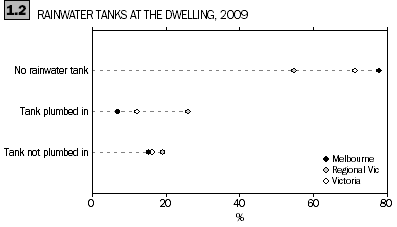 Households without a rainwater tank in Melbourne were more commonly rented dwellings. Most rental properties in Melbourne did not have a tank (95%) but the proportion was lower in regional Victoria where a smaller majority of rented dwellings (81%) did not have a tank.