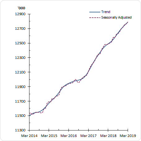 IMPACT OF TOWNSVILLE FLOODS IN FEBRUARY 2019 Flooding in Townsville in February 2019 resulted in a major disruption to the operation of the Labour Force Survey. Given the severity of these disruptions, which affected almost the entire region, and to ensure that this loss of sample did not affect data for Australia and Queensland, the ABS imputed sample for Townsville for February 2019. The imputation drew upon previous information that had recently been collected from people in Townsville. The ABS re-assessed this imputation, with reference to March 2019 data for Townsville, and has not revised the imputed data for February. The ABS will continue to monitor the data over coming months and undertake additional seasonal analysis of the imputed data in February 2020. ANNUAL SEASONAL RE-ANALYSIS The Annual Seasonal Re-analysis (ASR) of the Labour Force series was conducted on estimates up to February 2019. No changes have been made to Labour Force series as a result of this review. The ASR did highlight that there may be further improvements in the estimation of trend series. Early analysis suggest that indirectly trending rates may result in a smoother trend series, compared with the directly trended series. The ABS will investigate this recommendation further and will provide a summary of the results in coming months. TRANSITION TO 2016 ASGS The completion of the move to the Address Register in February 2019 completes the transition of the sample to the 2016 Australian Statistical Geography Standard (ASGS). The changes between the 2011 ASGS and 2016 ASGS at the SA4 level are minor, with one key exception. The 2016 ASGS supports the ‘WA outback’ being split into ‘WA outback – North’ and ‘WA outback – South’. The ABS is still assessing whether Labour Force data can support estimates for these two regions. In the meantime, these regions will continue to be published as ‘WA Outback (North and South)’. The ABS has not revised Labour Force data for any of the changes at the SA4 level. REVIEW OF DETAILED LABOUR FORCE DATA - QUARTERLY EDUCATIONAL ATTAINMENT AND SECTOR DATA The ABS is currently reviewing the usage of Labour Force data contained within the detailed monthly and quarterly releases (6291.0.55.001 and 6291.0.55.003), with an initial focus on quarterly educational attainment data and quarterly public and private sector data. As part of this review, the ABS has explored the feasibility of producing information on public and private sector employment in the Australian Labour Account. For further information on this, including some illustrative estimates, can be found at: Labour Account Australia, Quarterly Experimental Estimates, December 2018 (cat. no. 6150.0.55.003). The ABS is keen to hear from users of educational attainment and sector data, at labour.statistics@abs.gov.au, including how you use the data, the extent to which current data meet your requirements, and whether sector data would be a useful addition to the Australian Labour Account. UPDATE ON THE RELEASE OF 6224.0.55.001 The ABS was due to release the Labour Force, Australia: Labour Force Status and Other Characteristics of Families (cat. no. 6224.0.55.001) on 27 September 2018, with annual data up to June 2018. During the quality assurance of the 2018 data and the recent time series, the ABS identified that there was a greater level of variability in the weighted estimates for some of the less common family and household types (particularly multi-family households), and therefore opted to delay the release till 2019. The ABS has identified an issue with some family coding, which is affecting a range of key family estimates - particularly changes between June 2015 and June 2017. The issue is also impacting, to a lesser extent, on some variables in the four "relationship in household" products in Labour Force, Australia, Detailed – Electronic Delivery (cat. no. 6291.0.55.001) – including pivot tables FM1-FM4, as well as the first time series spreadsheet in that release, which contains estimates by social marital status. The 2019 publication will contain data for both June 2018 and June 2019. Revised data for the 2015-2017 period, will be released with a complete time series with the release of June 2020 data. The ABS apologises for this delay. Should you have any questions regarding this data, please contact us at labour.statistics@abs.gov.au. ROUNDING Estimates of changes in the commentary have been calculated using un-rounded estimates, and may be different from, but are more accurate than, movement obtained from the rounded estimates. Graphs also depict un-rounded estimates. SAMPLING ERROR The estimates in this publication are based on a sample survey. Published estimates and movements are subject to sampling variability. Standard errors give a measure of sampling variability. The interval bounded by two standard errors is the 95% confidence interval, which provides a way of looking at the variability inherent in estimates. There is a 95% chance that the true value of the estimate lies within that interval. MOVEMENTS IN SEASONALLY ADJUSTED SERIES BETWEEN FEBRUARY 2019 AND MARCH 2019