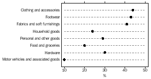 Motor vehicles and associated goods Sales and gross margin information for individual commodities within these broad categories are shown in Table 2. For a full explanation of the 'includes' and 'excludes' for individual commodity items the reader should consult the detailed descriptions in the Appendix. Of the $146.2 billion in retail sales recorded in 1998-99, the largest individual commodity was Petrol, diesel and distillate with $10.8 billion, followed by Take away food, ice cream, soft drinks, milk drinks etc. (for immediate consumption) with $7.5 billion and New cars and passenger vans with $7.1 billion. The commodity grouping with the largest sales was Food and groceries with $51.5 billion or 35% of total retail sales. According to estimated resident population figures for Australia at June 1999, this represented an average of $2,715 per head of population spent on food and groceries over the year. The major item in this commodity grouping was Take away food, ice cream, soft drinks, milk drinks etc. (for immediate consumption) with $7.5 billion, whilst $5.2 billion was spent on Fresh fruit and vegetables, $4.7 billion on Cigarettes, cigars and other tobacco products and $3.9 billion on Bread, cakes, pastries and biscuits. The next largest commodity group was Personal and other goods with sales of $31.6 billion, or 22% of retail sales. Of this amount $7.0 billion was spent on Medical and pharmaceutical products, $4.1 billion on Cosmetics, perfumes and toiletries and $2.1 billion on Newspapers, periodicals and maps. Motor vehicles and associated goods recorded $30.1 billion (or 21%) of total retail sales. Within this group the largest contributing commodities were Petrol, diesel and distillate ($10.8 billion), New cars and passenger vans ($7.1 billion) and Used cars and passenger vans ($6.9 billion). HISTORICAL COMPARISON Due to the differences in the commodity classifications between 1991-92 and 1998-99 only limited comparisons can be made and these are at the broader level aggregates. Of the eight retail commodity groups in 1998-99, all but Hardware are able to be compared with 1991-92. The percentage share of total retail sales of most of the seven comparable groups have remained fairly stable. The largest increases in percentage share of total retail sales occurred in Personal and other goods, up 5% to 22%. GROSS MARGIN Gross margin is the difference between the price for which a business purchases goods and the price for which they are sold. Gross margin information presented in Table 2 for each commodity has been expressed as a percentage of sales. The commodity groupings Clothing and accessories (44%), Footwear (43%) and Fabrics and soft furnishings (41%) recorded the highest gross margins. The highest margin for an indivdual commodity was in the Personal and other goods commodity grouping where the commodities Jewellery and Silverware both recorded a gross margin of 49%. The lowest gross margin by far was recorded in the commodity grouping Motor vehicles and associated goods with only 10%. The lowest single commodity within this grouping was New cars and passenger vans which recorded a gross margin of only 5%. PERCENTAGE GROSS MARGIN BY COMMODITY GROUPING EXPLANATORY NOTES SCOPE AND COVERAGE 1 The scope of the Retail Industry Survey was all public and private employing businesses in Australia, recorded on the ABS Business Register with a predominant activity of retailing (i.e. ANZSIC Division G). The ABS defines a retail business as a business mainly engaged in the resale of new or used goods to final consumers for personal or household consumption or in selected repair activities such as repair of household equipment or motor vehicles. The population for the Retail Industry Survey was taken from the ABS Business Register and was limited to the 116,000 employing retail businesses on the register in June 1999. Non-employing businesses were therefore excluded from this collection. 2 Approximately 7,200 business units were selected from the population using stratified random sampling techniques. All businesses with 50 or more employees and/or multi-state retailing business units were selected in the sample. 3 Data in this publication have been adjusted to allow for lags in processing new businesses to the ABS business register, and the omission of some businesses from the business register. The majority of businesses affected and to which the adjustments apply are small in size. For more information, please refer to ABS Information Paper: Improvements to ABS Economic Statistics, 1997 (Cat. no. 1357.0). REFERENCE PERIOD 4 The statistical results in this publication are based on the financial year ending 30 June 1999. In a minority of cases, where businesses did not account on a June-year basis, details were reported in respect of the accounting year that ended between 1 October 1998 and 30 September 1999. STATISTICAL UNIT 5 The unit about which information was collected in the Retail Industry Survey is termed the management unit.The management unit is the highest-level accounting unit within a business, having regard for industry homogeneity, for which accounts are maintained. In nearly all cases it coincides with the legal entity owning the business (i.e. company, partnership, trust, sole operator, etc.). In the case of large diversified businesses, however, there may be more than one management unit, each coinciding with a 'division' or 'line of business'. A division or line of business is recognised where separate and comprehensive accounts are compiled for it. CLASSIFICATION BY INDUSTRY 6 This publication presents statistics in Tables 1, 3 and 4 classified according to the Australian and New Zealand Standard Industry Classification, 1993 (Cat. no. 1292.0). Each business unit is classified to a single industry. The industry allocated is based on an estimate of the primary activity of the management unit irrespective of whether a range of activities or a single activity is und