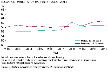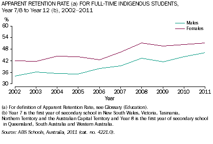 COMMENTARY EDUCATION PARTICIPATION AND RETENTION In 2011, about 60% of both men and women aged 15-24 years were participating in education. The education participation rate for women was higher than for men in each of the older age groups up to 64 years. In 2011, the apparent retention rate through secondary school to Year 12 for full-time students was higher for females (84%) than for males (75%). Participation in education is frequently used as an indicator of the wellbeing of young people. Many young people continue in full-time education immediately after completing compulsory schooling. Participation in education is measured in two different ways: by the proportion of selected age groups who are students; and also by the apparent retention rate of students from Year 7/8 to either Year 10 or Year 12. Education and training help people to develop knowledge and skills that may be used to enhance their own wellbeing and that of the broader community. For an individual, education is widely regarded as a key factor in developing a rewarding career. For the nation, having a skilled work force is vital in supporting ongoing economic development and in improving living conditions. Changes in social attitudes towards the roles and responsibilities of males and females in the latter part of the last century have led to increases in the educational participation of females across all age groups. (Endnote 1) EDUCATION PARTICIPATION RATE, 15-24 YEARS About 60% of those aged 15-24 years are participating in education beyond compulsory schooling. In 2011, the participation rate for both males and females in the 15-19 year age group (around 80%) was close to double that for the 20-24 year age group. While the participation rate for the 20-24 year old females group was lower than for the 15-19 year age group, between 2002 and 2011 participation in education by the older female age group rose by 5.5 percentage points. The 60% or so participation rate for both males and females aged 15-24 years in 2011 increased by around 2 percentage points from 2002. APPARENT RETENTION RATE As noted above, in 2011 the apparent retention rate for full-time students through secondary school, from Year 7/8 to Year 12, was higher for females (84%) than for males (75%), and it has been higher in each of the previous nine years. The apparent retention rate for full-time students is an indicator that measures the extent to which young persons are continuing their participation in secondary school education and is regarded as an important measure of the performance of education systems and related government policies. (Endnote 1) An apparent retention rate is a measure of the number of school students in a designated year of education expressed as a percentage of their respective cohort group in a base year, such as from the first year in the secondary school (Year 7/8) to Year 10 or Year 12. Apparent retention rates are useful but they do not account for students repeating a year or migrating into or out of the relevant school student population. (See the Glossary (Education) for more information on apparent retention rates.) ABORIGINAL AND TORRES STRAIT ISLANDER PEOPLES A key element in 'closing the gap' between Aboriginal and Torres Strait Islander Australians and non-Indigenous Australians relates to educational participation and attainment. While the education gap has narrowed somewhat over recent years, educational participation and attainment rates for Aboriginal and Torres Strait Islander Australians still remain well below those of non-Indigenous Australians. This is due to a range of factors including economic disadvantage, social marginalisation, health problems, differences in community expectations and geographical isolation. (Endnote 1) Education participation rate In 2008, the participation rate in formal learning for both male and female Aboriginal and Torres Strait Islander Australians aged 15-24 years was 41%. The participation rate was much higher for the 15-19 year age group (around 60%) compared to the 20-24 year age group (around 16%). Apparent retention rate The apparent retention rate from Year 7/8 to Year 12 for full-time Aboriginal and Torres Strait Islander students has improved since 2002. For male students it rose from 34% in 2002 to 46% in 2011, and for female students it increased from 42% to 51%. While these improvements in retention rates are much greater than those achieved for the total population over this period, in 2011 the apparent retention rate from Year 7/8 to Year 12 for full-time Aboriginal and Torres Strait Islander students was still only about 60% of that achieved for the total population.
