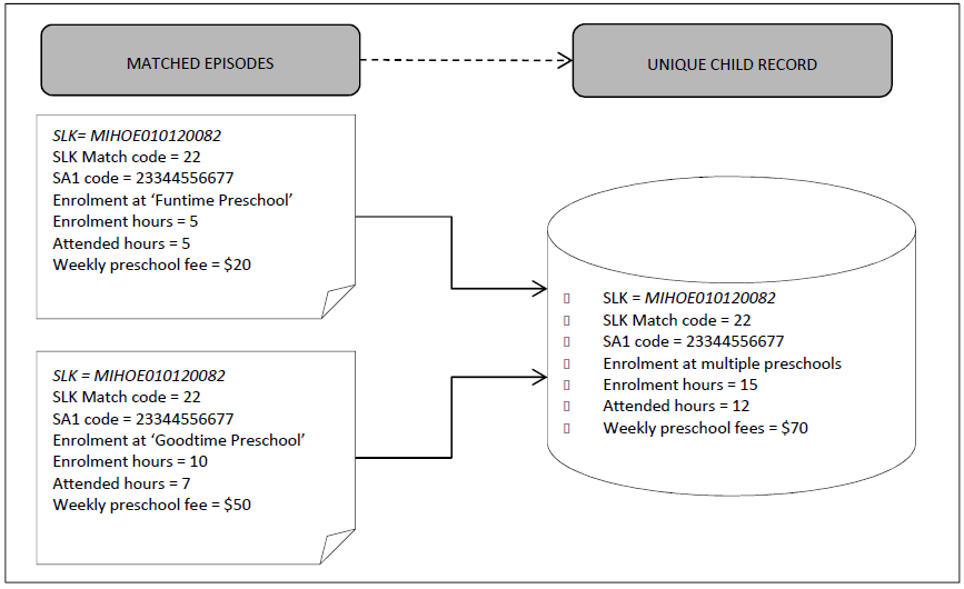 Where two or more child episodes are linked, the unique characteristics within each episode are used to formulate the characteristics of the corresponding unique child record. Figure 3.13 outlines two linked episodes from two different preschool programs with weekly preschool fees, enrolment and attendance hours. This information is used to create a unique child record from the same data source supplied for the National ECEC Collection.