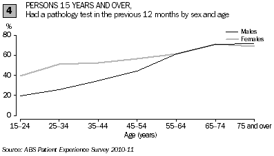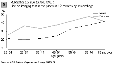 Almost half of persons aged 15 years and over in Australia (48%) had a pathology test in the previous 12 months. Women were more likely to have had pathology tests (55% compared with 42% of men) (see Table 3). Around 5.6 million persons aged 15 years and over (32%) had an imaging test in the previous 12 months. Women were also more likely to have had an imaging test than men (37% and 26% respectively) (see Table 3). Differences in imaging and pathology testing between men and women in the younger age groups are likely to be due in part to pregnancy and childbirth, as well as the use of pap smears and mammography. Cost was a barrier to some, with 7% of persons who needed an imaging test in the most disadvantaged areas delaying or not getting one because of the cost, compared with 5% in the least disadvantaged areas (see Table 6).