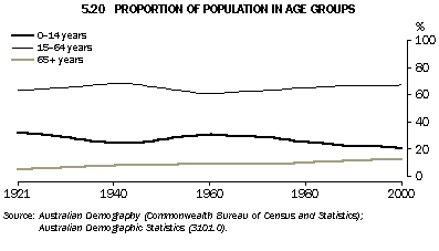 Since the first half of the 20th century, Australians have been having smaller families. This is reflected in a fall in the proportion of children (aged under 15) within the population from 35% in 1901 to around 21% in 2000. Conversely, the proportion of the population aged 65 and over has increased markedly, from 4% in 1901 to 12% in 2001. These features are shown in graph 5.20.