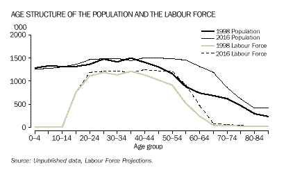 SUMMARY OF FINDINGS The labour force is projected to age quite dramatically, with over 80% of the projected labour force growth occurring in the 45 years and over age group. Females are projected to increase from 43% to 45% of the labour force. HOW LIKELY IS IT THAT THESE PROJECTIONS WILL EVENTUATE? The bulk of the labour force in 2016 will be made up of people who are currently alive and in Australia. The size and age distribution of the current Australian population is the most important factor in determining the size and age distribution of the labour force in 2016. Changes in participation rates, and the components of population growth (birth and death rate and overseas migration levels) will have a relatively small impact on the future labour force. THE FUTURE WON’T BE LIKE THE PAST Because of the ageing of the population, population growth will slow. Therefore, it will not be possible for labour force growth to continue at historic rates. Immigration and labour force participation rates may rise, which would moderate the fall in employment growth. However, any increase in these components is unlikely to be large enough to prevent a significant fall in employment growth from historical levels. Document Selection These documents will be presented in a new window.