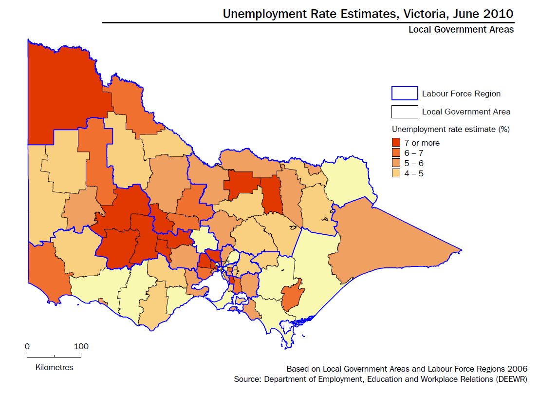 The Australian Government Department of Education, Employment and Workplace Relations (DEEWR) produce unemployment rate estimates at Statistical Local Area (SLA) level, using information derived from the ABS Labour Force Survey (LFS), supplemented by small area data from the ABS Census of Population and Housing and Centrelink.