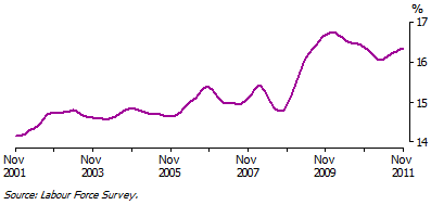 | Labour force underutilisation rate | % | Trend | Nov 11 | 12.5 | (c) 0.2 | (c) 0.3 |