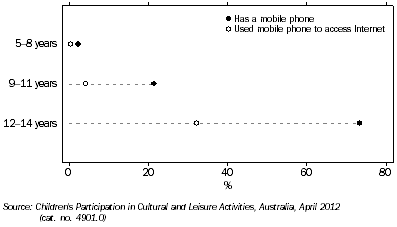 Another way people access the Internet is by using their mobile phone. At the time of interview in April 2012, 29% of children had a mobile phone. Mobile phone ownership was more common in older age groups with 73% of children aged 12-14 years, 22% of children aged 9-11 years, and 2% of children aged 5-8 years owning a mobile phone. Only 11% of children aged 5-14 years used their mobile phone to access the Internet. Most of this usage can be attributable to the 12-14 year age group with almost one third (32%) of children in this age group accessing the Internet on their mobile. IS INCREASED SCREEN TIME ASSOCIATED WITH LOWER SPORT PARTICIPATION? Results from the 2012 CPCLA suggest that participation rates in organised sport and/or dancing were lower for children who spent 20 hours or more participating in other screen-based activities. However time spent watching TV, DVDs and videos did not have as much of an impact on participation rates. Children who spent 20 hours or more participating in other screen-based activities in the last two weeks of school had lower participation rates in organised sport and/or dancing (62%). In contrast, children who spent less time participating in other screen-based activities had participation rates of over 68%. Just under two thirds (64%) of those who spent 20 hours or more watching TV, DVDs or videos participated in organised sport and/or dancing. This was a lower participation rate compared with children who spent 3-4 hours watching TV, DVDs or videos (72%) and children who spent 5-9 hours and 10-19 hours (69%) on this activity. However there was not enough evidence to suggest that this was significantly different to the participation rate for children who spent 2 hours or less watching TV, DVDs or videos (68%). Duration of children's participation in screen-based activities (a), By participation in organised sport and/or dancing (a) In terms of Internet use and organised sports participation, children who accessed the Internet for longer were less likely to play sport in the 12 months prior to interview compared with children who spent fewer hours on the Internet at home. Participation in organised sport was lowest for children who accessed the Internet at home for 20 hours or more with 52% having played one sport or more while 48% played no sport at all in the 12 months prior to interview. In contrast, 69% of children who accessed the Internet at home for 2 hours or less participated in organised sport, with 31% not participating in organised sport. ENDNOTES 1. World Health Organisation, Obesity and Overweight Fact Sheet, Accessed 26 February 2013 <http://www.who.int/mediacentre/factsheets/fs311/en/> 2. Commonwealth Department of Health and Ageing, 2013 Australian Dietary Guidelines, Accessed 20 February 2013 <http://www.eatforhealth.gov.au/sites/default/files/files/the_guidelines/n55_australian_dietary_guidelines.pdf> 3. Green, L., Brady, D., Òlafsson, K., Hartley, J. and Lumby, C., 2011, Risks and safety for Australian children on the Internet: Full findings from the AU Kids Online survey of 9-16 year olds and their parents, AU Kids Online, Accessed 27 February 2013 <http://cultural-science.org/journal/index.php/culturalscience/article/view/49/129> Document Selection These documents will be presented in a new window.