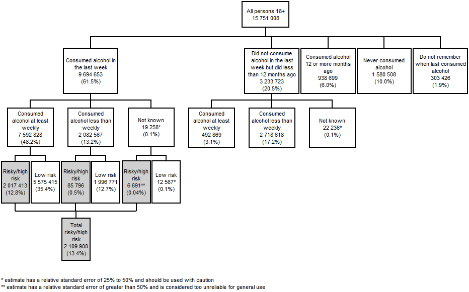 In order to estimate levels of alcohol consumption, respondents in the 2007-08 National Health Survey (NHS) were asked about their alcohol consumption in the last week and over the last 12 months. See the National Health Survey: Data Reference Package, 2007–08 (cat. no. 4363.0.55.002) for a copy of the questionnaire used, as well as the National Health Survey: Users' Guide, 2007-08 (cat. no. 4363.0.55.001) for more information. CALCULATING LONGER TERM RISK ACCORDING TO THE 2001 GUIDELINES To measure risk in the longer term according to the 2001 National Health and Medical Research Council (NHMRC) guidelines, the NHS asks questions about how recently a person had consumed alcohol, and how frequently in the last 12 months. If they had consumed alcohol in the last week, they were then asked on which days of the week they had consumed alcohol. These respondents were asked further, detailed questions about the alcoholic beverages they had consumed on each of the 3 most recent days on which they had consumed alcohol. This information was used to calculate their average consumption over those 1–3 days, from which their average daily alcohol consumption over the last week (in standard drinks) was estimated. It should be noted that in this series of questions, respondents were not asked about standard drinks; rather, they were asked about the type, brand, number and serving sizes of the beverages they consumed, from which the number of standard drinks was derived. Using the estimated average daily alcohol consumption over the last week, respondents were grouped into three categories of relative risk level: low, risky or high risk, based on the 2001 NHMRC guidelines for minimising risk in the longer term. Individuals whose consumption placed them in the risky and high risk categories had exceeded the recommended guidelines. Diagram 1 illustrates how respondents were grouped into categories of longer term risk based on the 2001 guidelines. DIAGRAM 1: CALCULATING LONGER TERM RISK ACCORDING TO 2001 GUIDELINES According to the 2001 guidelines, in 2007-08 there were 2.1 million persons (13.4% of persons aged 18 years or over) who consumed alcohol at risky or high risk levels in the longer term, based on consumption of alcohol in the last week. A further 492,900 people (3.1%) who did not consume alcohol in the last week, normally consumed alcohol on a weekly basis. It is possible that a proportion of these also consumed alcohol at risky or high risk levels. Likewise there were 2.7 million people (17.2%) who, while they did not consume alcohol in the last week, normally consumed alcohol but on a less than weekly basis during the last year. It is also possible that a proportion of these people consumed alcohol at risky or high risk levels. At the same time, there were 1.6 million people (10.0%) who had never consumed alcohol and a further 938,700 people (6.0%) who last consumed alcohol 12 or more months ago. CALCULATING LIFETIME RISK ACCORDING TO THE 2009 GUIDELINES The questions asked in the 2007-08 NHS can also be used to estimate the number of people who exceeded or did not exceed the 2009 NHMRC lifetime guidelines. As for the 2001 guidelines, this is based on their average daily alcohol consumption over the most recent 3 days on which they consumed alcohol. Diagram 2 illustrates how respondents were grouped according to the 2009 guidelines. DIAGRAM 2: CALCULATING LIFETIME RISK ACCORDING TO 2009 GUIDELINES According to the 2009 guidelines, in 2007-08 there were 3.3 million persons (20.9% of persons aged 18 years or over) who exceeded the recommended guidelines for minimising risk in the longer term. This is greater than the number exceeding the 2001 guidelines for longer term risk (2.1 million persons, or 13.4%). The difference is due to the lower threshold of standard drinks at which a male exceeds the 2009 guidelines compared with the 2001 guidelines. As for the 2001 guidelines, it is possible that a proportion of the people who normally drank alcohol weekly but did not do so in the previous week also exceeded the 2009 guidelines. TABLE 1: 2007-08 NATIONAL HEALTH SURVEY, Persons exceeding longer term/lifetime guidelines(a)