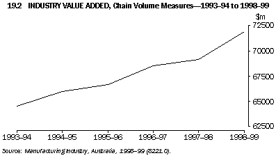 Industry value added (IVA) measures the value of industry outputs less the value of materials and services purchased and used up in the production of those outputs. Graph 19.2 depicts growth in chain volume measures of IVA for the period 1993-94 to 1998-99 inclusive. Total IVA for 1998-99 in chain volume terms was $71,981m, representing a 3.9% increase over 1997-98, with an 11.4% increase over the five year period from 1993-94.